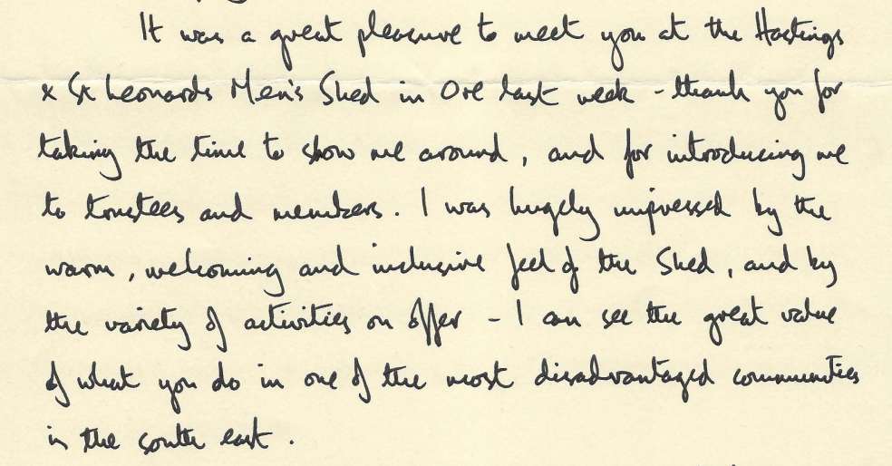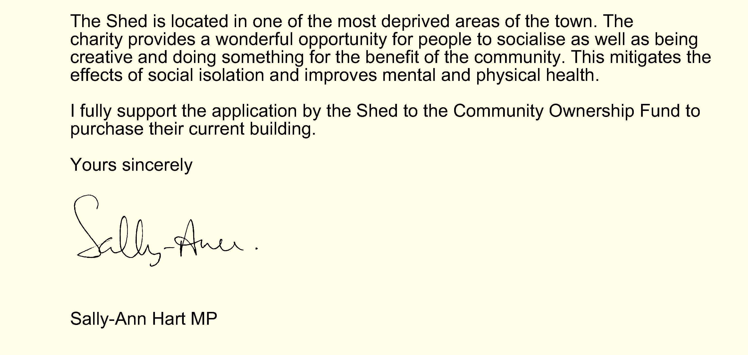 A visit, by our then local member of parliament, Sally-Ann Hart who followed up with a letter of support for out charity.